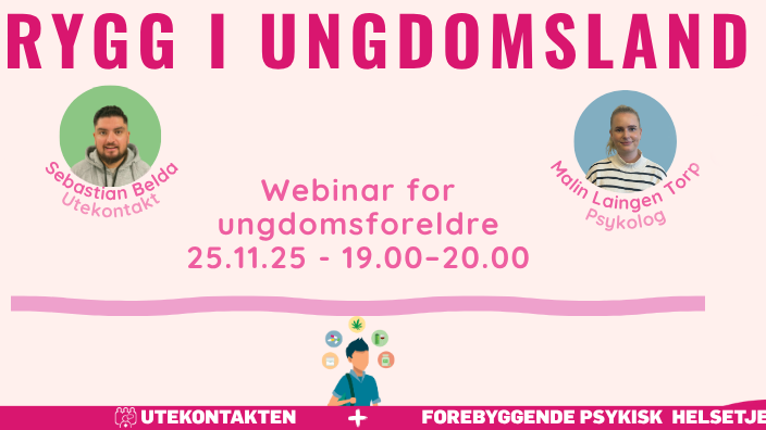 Trygg i ungdomsland – digitalt webinar for ungdomsforeldre Utekontakten og Forebyggende psykisk helsetjeneste (FPH) inviterer til digitalt webinar for ungdomsforeldre: "Trygg i ungdomsland".
