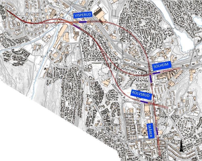 - Alternativ B, med tre stasjoner: Visperud, nord- og syd på Skårersletta.