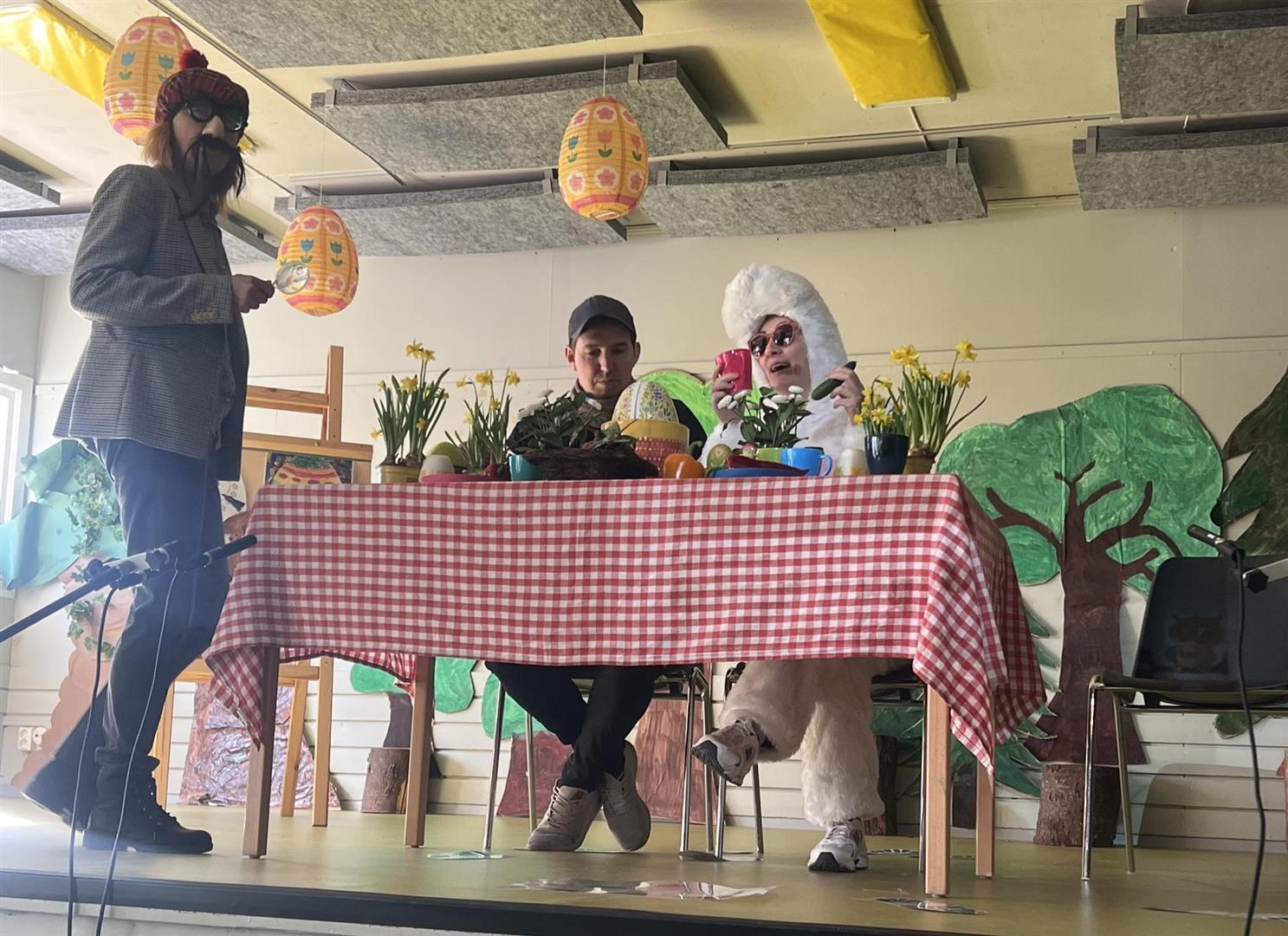 Bokuka ble høytidelig åpnet med felles snorklipp og et skuespill der påskeharen ble bortført. Avslutningen ble like storslått, med bidrag fra alle trinn og påskeharen kom heldigvis til rett igjen i slutten av skuespillet.