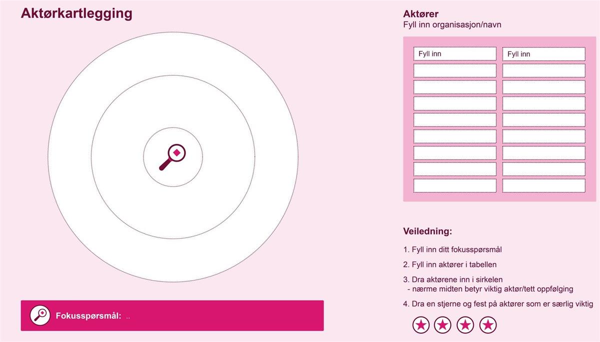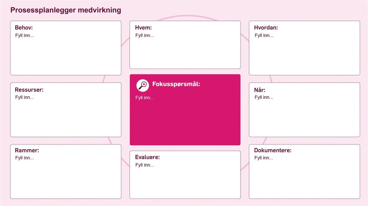 Verktøy - PlanleggeLytt til tekstenStopp avspilling Prosessplanlegger medvirkning Lørenskog kommune Prosessplanleggeren hjelper deg med å få oversikt over viktige elementer du bør tenke på for å få en god medvirkningsprosess. Lenke til mal og veiledning prosessplanlegger. (PPTX, 3 MB) Aktørkartlegging Lørenskog kommune Aktørkartlegging gjør at du får oversikt over hvem du skal involvere i prosessen. Lenke til mal og veiledning. (PPTX, 2 MB)Lenke til mal og veiledning. (PPTX, 2 MB) KommunikasjonsplanKommunikasjonsplan gir deg oversikt over når du skal kommunisere med hvem og i hvilken kanal.Her kommer lenke til kommunikasjonsplan. Klikk her for alle verktøy Publisert av Lillian Jahr Oterholt Sist endret 26.08.2025 12.50