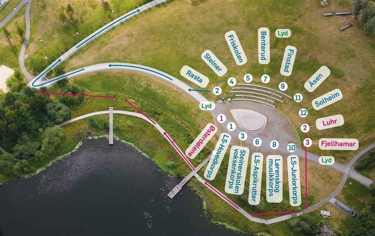 Kartutsnittet under viser hvor skolene og korpsene skal stille opp i Rådhusparken 17. mai. Vi anbefaler oppmøte fra klokken 09.30. Fellesarrangementet starter klokken 10.00.