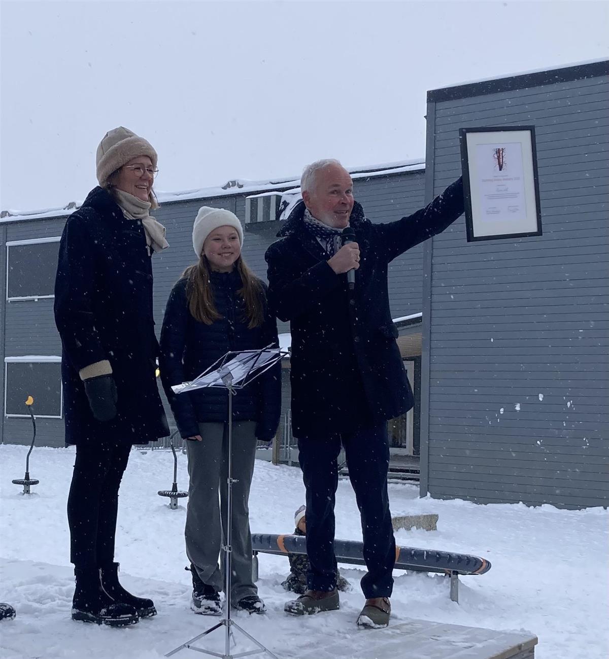 Rektor og elevrådsleder mottar diplomet fra Statsforvalter Jan Tore Sanner.Mandag 6. januar hadde Rasta skole storfint besøk.