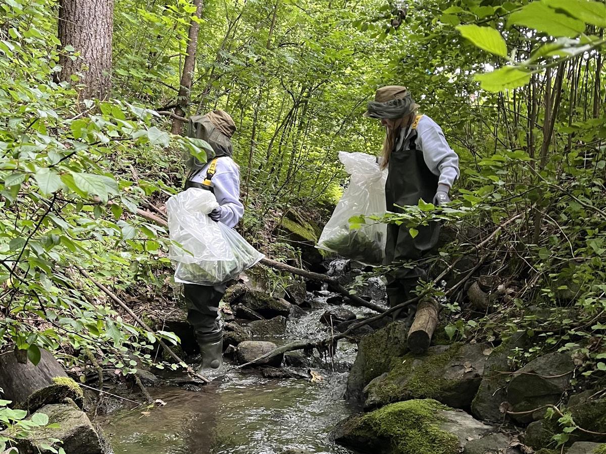 Fjerning av den uønskede fremmede arten kjempespringfrø langs Røykåsbekken.