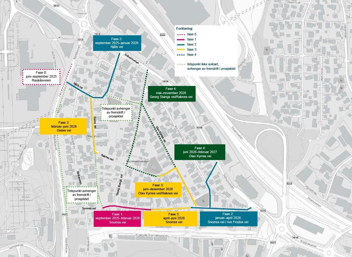 Anleggsarbeidene starter i april 2025 og pågår fram til høsten 2027, og de skal gjennomføres i flere faser. I kartet nedenfor ser du når vi planlegger å arbeide hvor. Vi vurderer hele tiden hvordan prosjektet kan gjennomføres på en best mulig måte og så effektivt som mulig, så faseplanen kan endre seg etter hvert som arbeidene går framover.