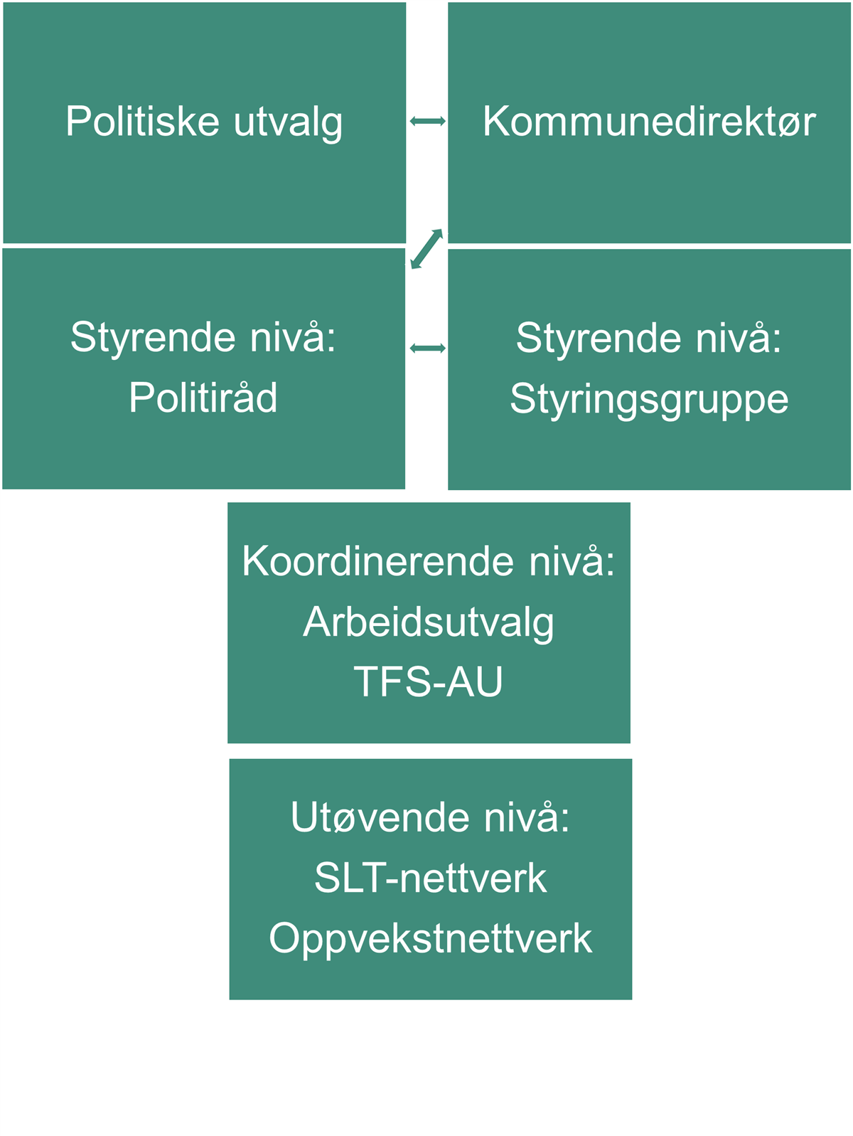 Modell av organiseringLytt til tekstenStopp avspillingModell av organiseringPolitiske utvalgKommunedirektørStyrende nivå:PolitirådStyringsgruppeKoordinerende nivå:Tverrfaglig system - ArbeidsutvalgUtøvende nivå:SLT-nettverkOppvekstnettverk Publisert av Kristian Olav Hvesser Sist endret 27.04.2026 12.12