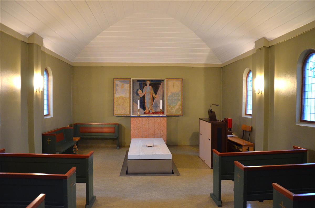 Inne i Lørenskog kapell, altertavle av Henrik Sørensen og Bjarne Rise