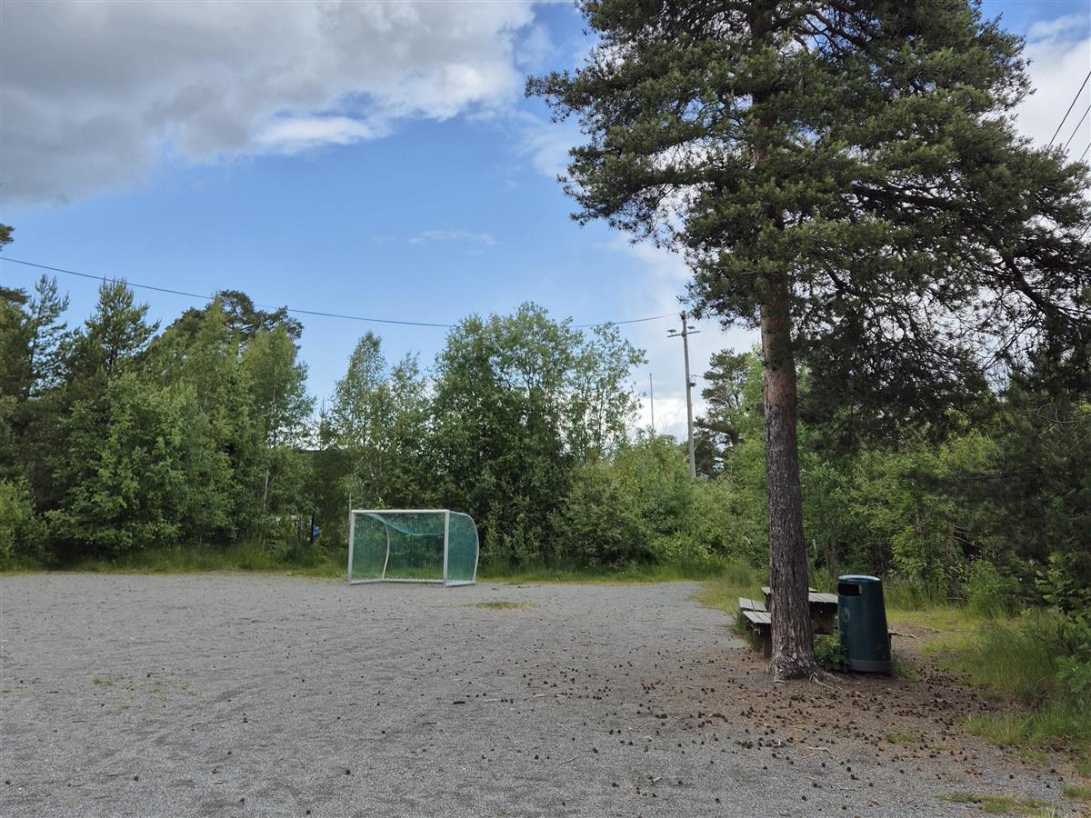 Ved siden av ligger en grusbane med store mål og flere benkebord.