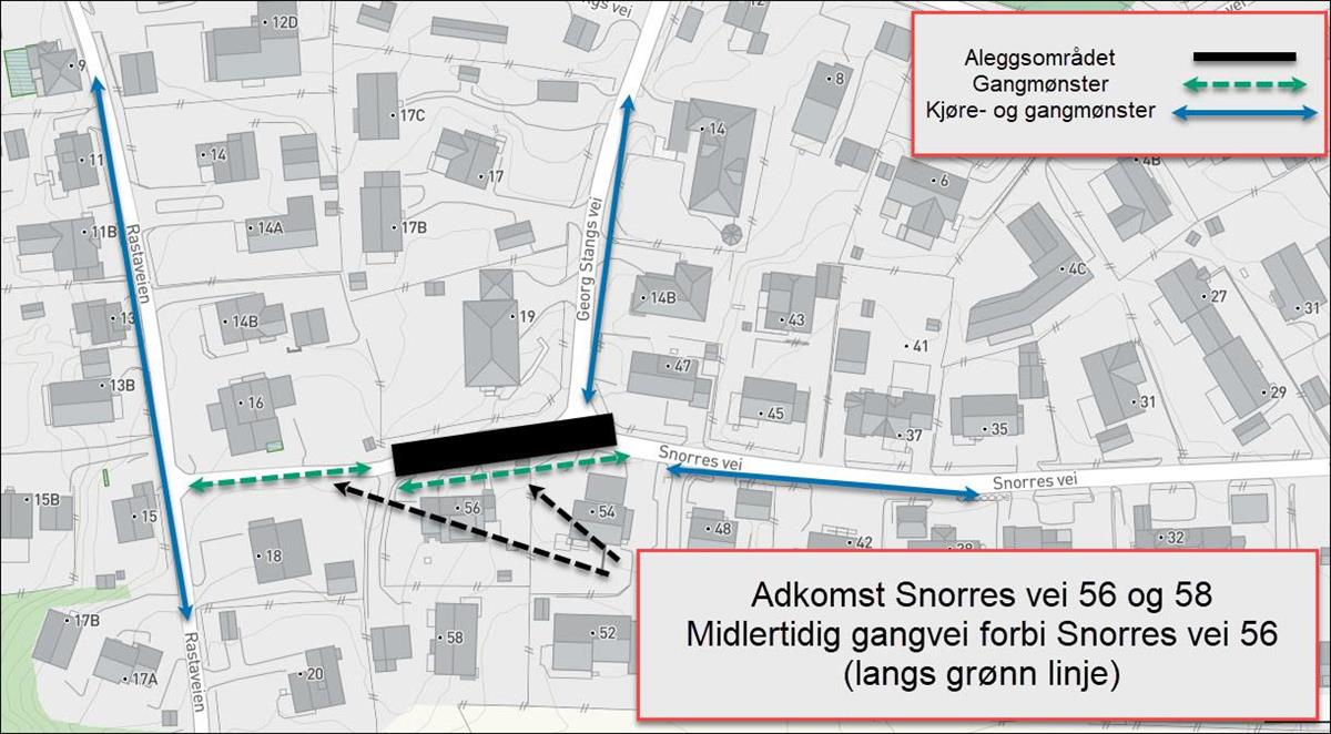 Det pågår også anleggsarbeider i vestre del av Snorres vei, frem mot krysset Georg Stangs vei / Snorres vei. Kjøre- og gangmønster er vist i figur 2. Arbeidene vil bevege seg østover i Snorres vei.
