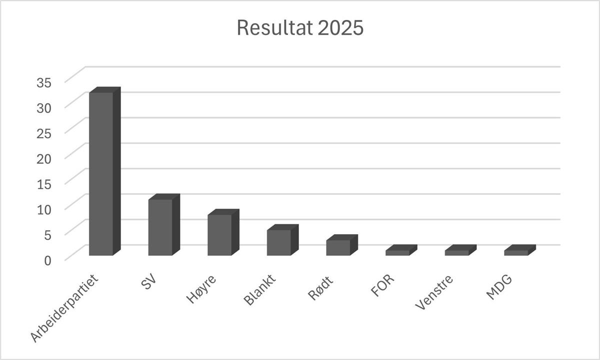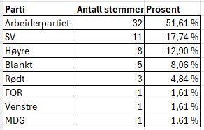 Det var 62 deltakere som stemte, og det største partiet ble Arbeiderpartiet med 32 stemmer. Det var Linn og Kathrine som talte opp stemmene. Vi oppfordrer alle som har stemmerett til å stemme!
